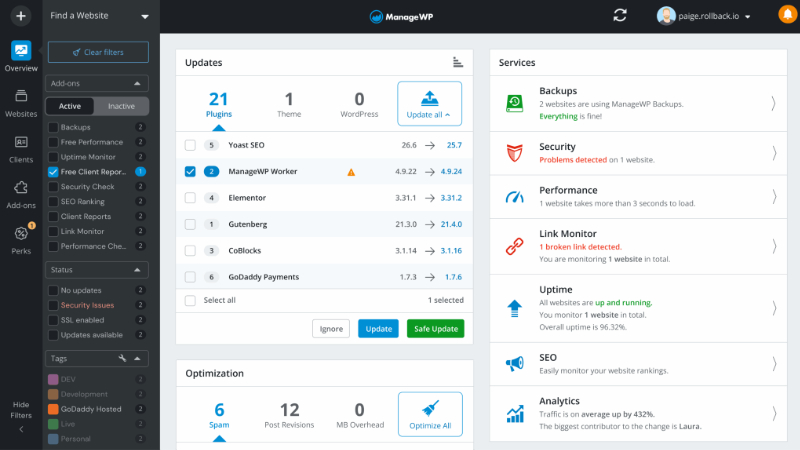 사이트의 보안, SEO 랭킹 변화, 꺠진 링크 등을 점검한 월간 리포트가 이메일로 발생됩니다.